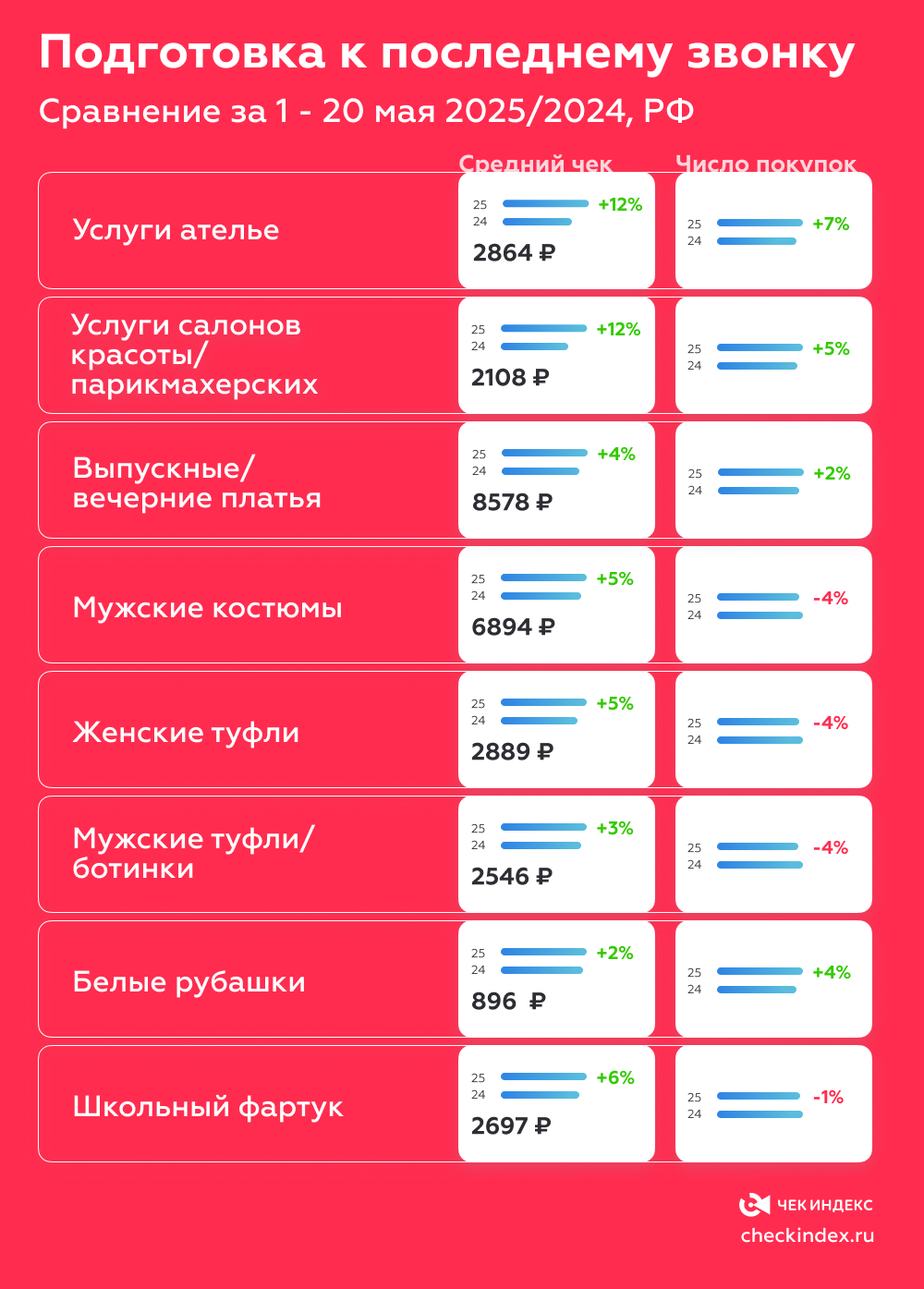 школьный фартук – средний чек 2697 руб., на 6% выше, чем год назад. Число покупок – снизилось на 1%