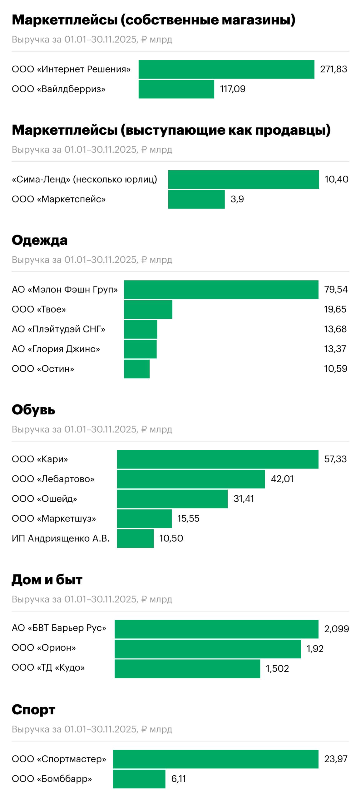 Лидеры в сегменте «Одежда» - АО "Мэлон Фэшн Груп" (79,54 млрд руб), ООО "Твое" (19,65 млрд руб), АО "Плэйтудэй СНГ" (13,68 млрд руб), АО "Глория Джинс" (13,37 млрд руб), ООО "Остин" (10,59 млрд руб).