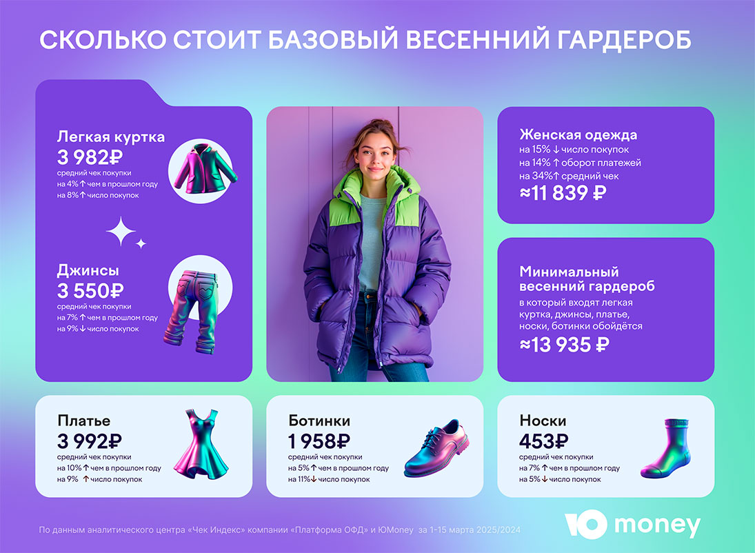 Аналитики кошелька ЮMoney и аналитического центра «Чек Индекс» компании «Платформа ОФД» изучили тренды продаж одежды и выяснили, сколько стоит собрать базовый весенний гардероб. Эксперты проанализировали онлайн- и офлайн-платежи в категории одежды и аксессуаров с 1 по 15 марта 2025 года и сравнили полученные данные с прошлогодними.